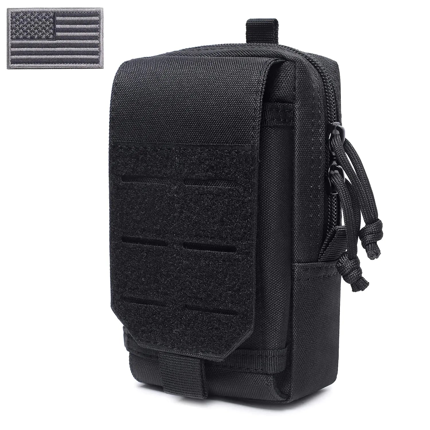 A durable, water-resistant 1000D nylon tactical EDC pouch (6.5" × 4.1" × 1.5") with MOLLE compatibility for belts, vests, backpacks and other gear. It features a laser-cut front velcro panel for attaching patches or accessories, plus a front pocket designed to hold most smartphones securely with hook-and-loop. Inside are three compartments — a main section, mesh pocket and small pocket — along with 2-way zippers and inner secure loops to keep essentials organized and easy to reach. Includes a US flag patch; ideal for camping, hiking, walking and everyday use.